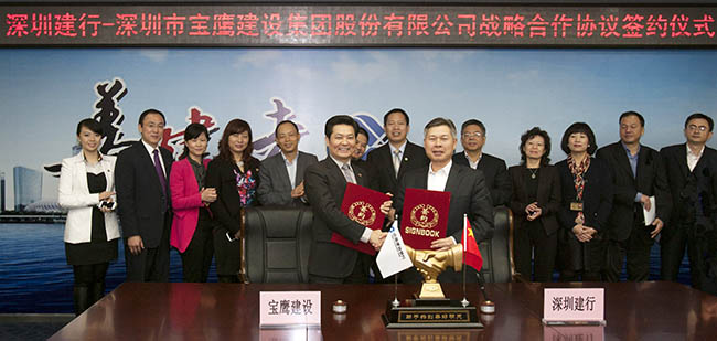 11月28日,中国建设银行深圳市分行与深圳市宝鹰建设集团股份有限公司签定了授信25亿元的战略合作协议。当日下午,在建设银行深圳市分行与宝鹰股份相关出席领导的共同见证下,建设银行深圳市分行副行长戴惠明和宝鹰股份董事局主席古少明分别代表建设银行深圳市分行和宝鹰股份签定了战略合作协议。
