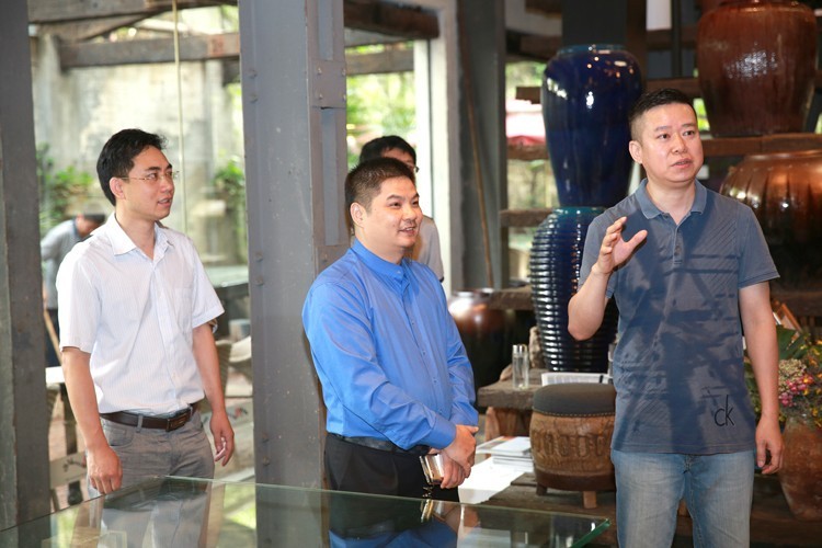 陈育宏副董事长在向古朴副总裁一行介绍办公空间的设计风格