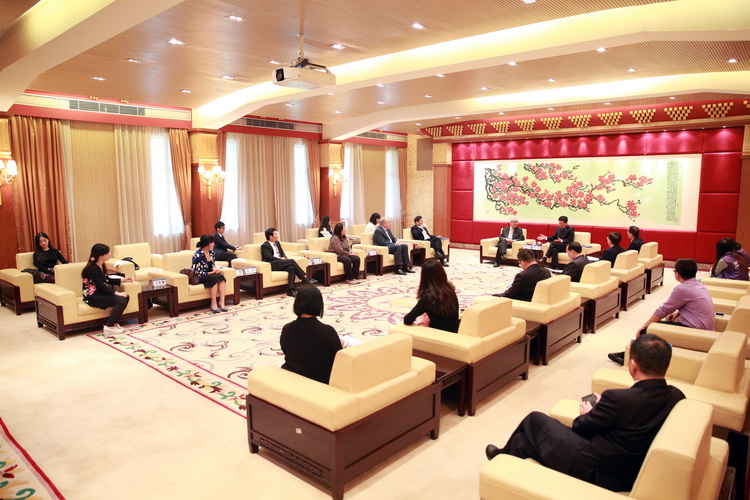 广外党委书记隋广军(右一)会见宝鹰讲堂三位主讲人邓文中院士(右二)、李大西博士(左二)、Anderson教授(左一)